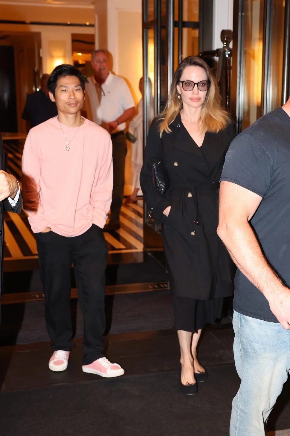 The next night, Angelina had some mother-son time with Pax, as the pair went to dinner together in the West Village. Pax sported a long sleeve salmon colored T-shirt, which he paired with matching sneakers and black pants, while Angelina wore an all-black look complete with a trench coat.